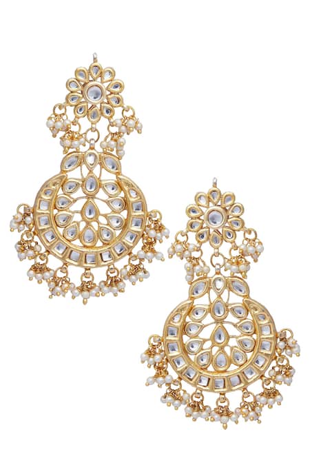 Gold plated chandbalis featuring intricate floral designs with Kundan stones and bead embellishments