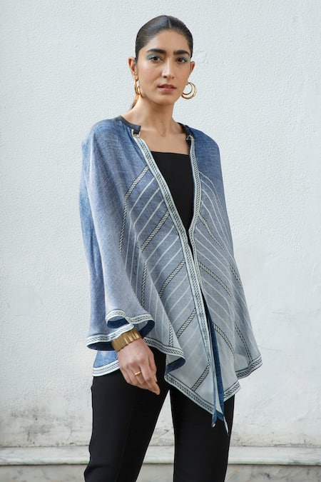 Blue Bamberg Satin Horse Motif V Neck Printed Cape