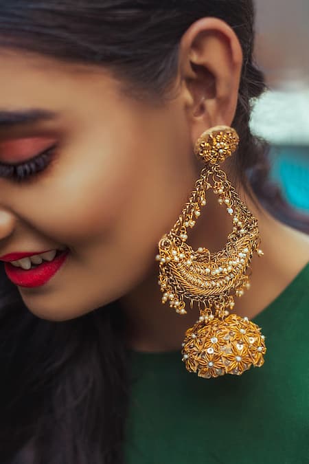 Gold chandbali featuring moti drops, dabka, tikki embroidery, and a center cut-out
