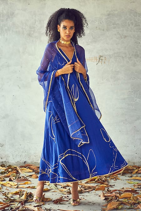 Blue tunic with floral print & flared bottom. Paired with dupatta.