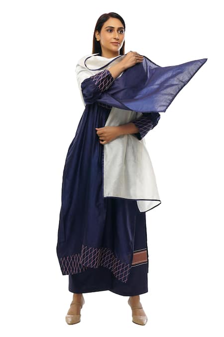 Navy blue dress featuring a leaf neckline and cuff sleeves, crafted in chanderi. Paired with coordinating pant and contrast scarf.