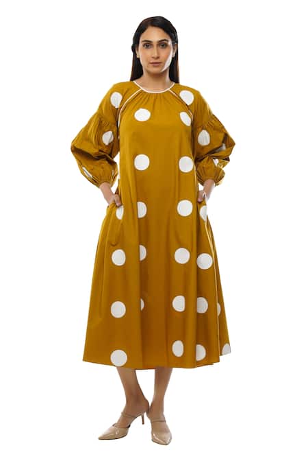 Yellow Cotton Round Neck Polka Dot Pattern Poplin Dress