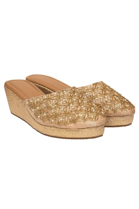 Gold platform wedges featuring intricate cutdana and sequin embroidery