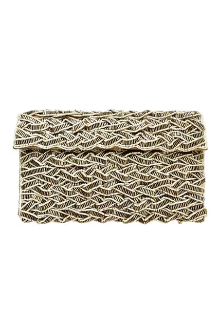 Gold rectangular-shaped clutch featuring handwoven and hand embroidered pearls in a braided texture