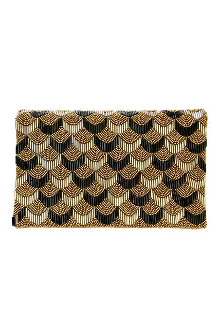 Black and gold embellished velvet clutch featuring scallop motif hand embroidered with baby pearls and glass cylinder beads