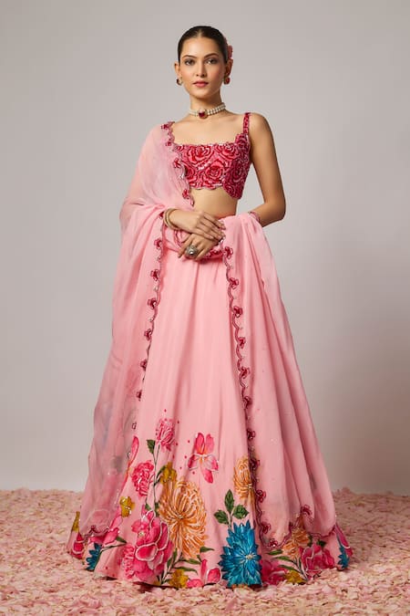 Pink Silk, Organza Embroidery, Sequins Square Neck Floral Hand Lehenga Set