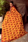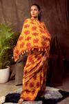 Mustard cotton chanderi saree featuring a contrast blooming flower print and tassel lace. It comes along with unstitched blouse fabric.