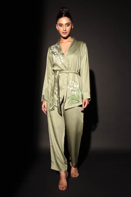 Green kimono style jacket featuring hand-painted lilies with a tie-up belt. Paired with matching pants for a coordinated look.