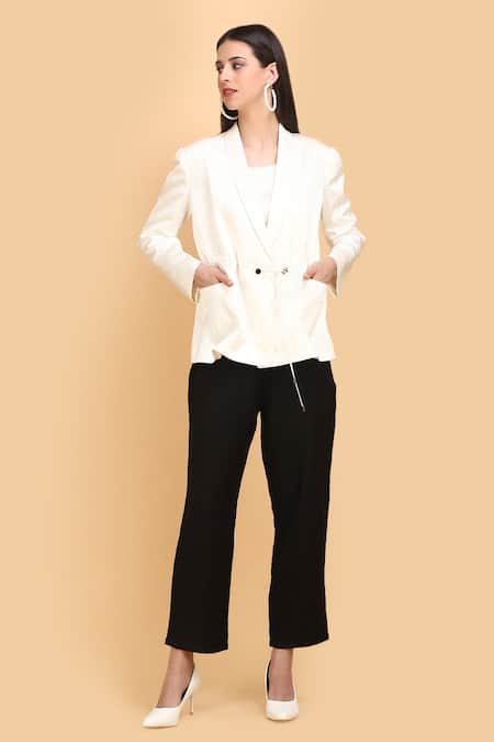 Off white blazer in pure silk charmeuse satin featuring a lapel neckline and full sleeves. Paired with a matching bustier and includes button and pocket detailing.