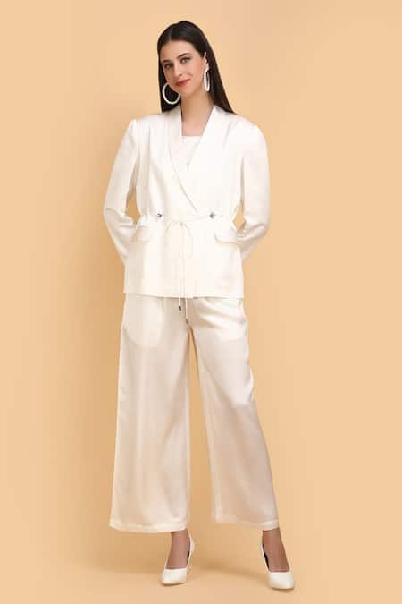 Off White Silk Round Neck Tie-up Blazer Trouser Set