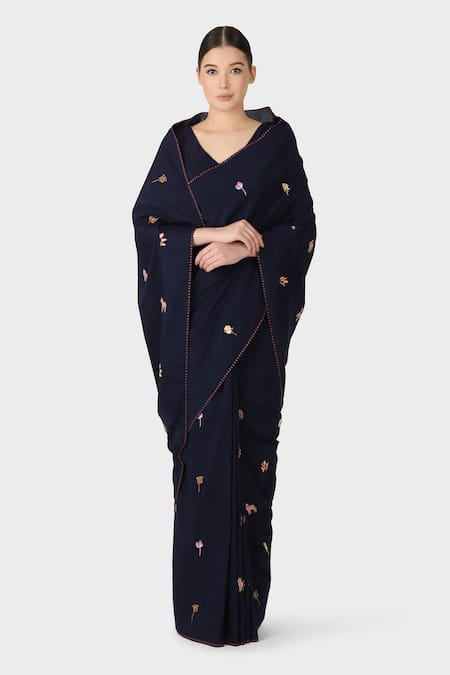 Navy blue saree featuring resham hand embroidered animal & floral motifs all over with running stitch on the hem