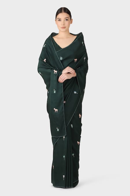 Green saree featuring resham hand embroidered animal & floral motifs all over