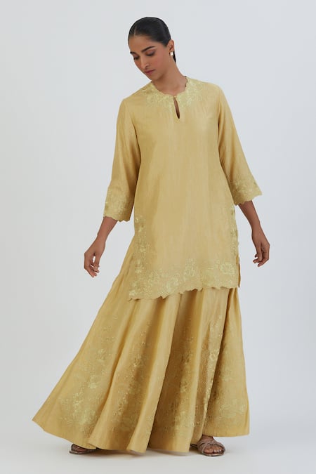 Yellow Silk Embroidery Wild Bloom U Neck Blossom Kurta With Sharara