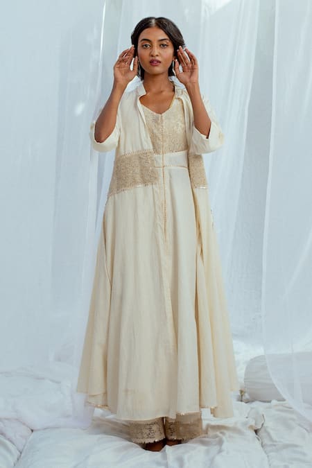 Off-white hand-woven cotton overcoat with floral embroidery in cream, zari & cutwork.