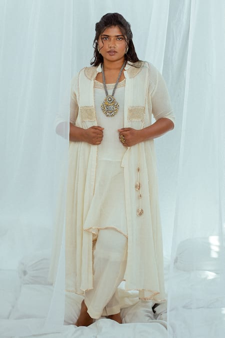 Off-white handwoven cotton jacket, embellished with cream and silver-gold machine embroidery.