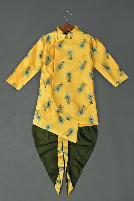 Yellow kurta featuring feather print and sequins embroidery with a Mandarin collar. Paired with a bottle green dhoti with an elasticated waistline.