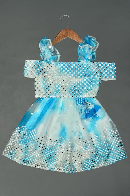 Blue organza top with cold shoulder design featuring ruffled straps and mirror embroidery. Paired with a matching lehenga that has an elasticated back and tie-dye print.