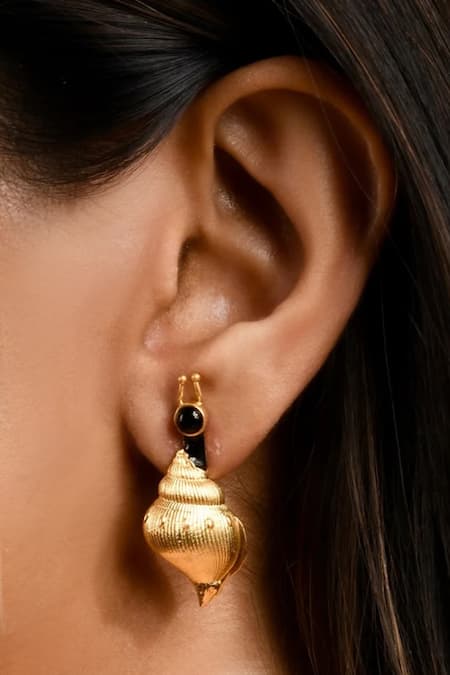 No of Component: 1Components: EarringsNoteworthy Feature: Snail shell design, Black enamel accents, Textured gold-plated finishOccasions: Versatile for party, festive, and semi-formal occasionsStyle Genre: Contemporary Western style earringsPattern: Self DesignColor: GoldComposition: Brass, EnamelSize Details: 1.5" in lengthWeight Details: 9gmVisible Items not included: Only the snail earrings are being sold.Care Instruction: Moisture damages the gold plating. Please avoid contact with liquids and store in the provided pouch.Style: Stud earrings with a dangling shell designPattern Style: Textured shell designClosure Style: Push back closureLength: Short length earrings, 1.5 inchesExact Length: 1.5 inches in lengthExact Weight: 9 grams in weightBack Finding: Post back findingFinish Style: 24k gold-plated brass with a polished finishPlating: 24K gold platingSetting Style: Bezel setting for the black enamel stoneShape: Conch shell shapeWeight: Lightweight earrings, 9 gramsGemstone Shape: Round black enamel gemstoneGemstone Transparency: Opaque black enamel gemstone