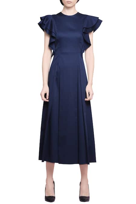 Blue cotton satin flared dress with inverted pleats & layered ruffle sleeves.