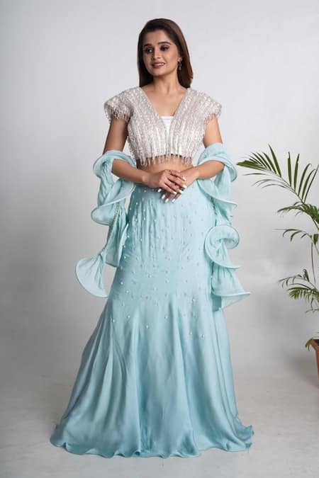 Aqua modal satin fish-cut lehenga featuring pearl embroidery and attached cancan. Accompanied by an off-white padded blouse with grey cutdana latkan lace work and a ruffled dupatta.