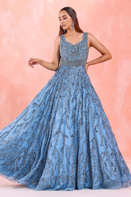 Steel blue sleeveless gown with tonal sequins and beads embroidery.