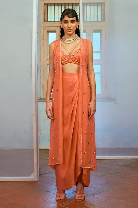 Pink Organza, Tussar, Satin Pearls Open Neck, Work Jacket Draped Skirt Set