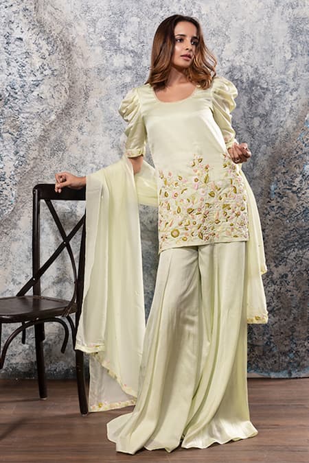 Green kurta with embroidered floral motifs on hem and sleeve hems. Comes with flared pant and sheer dupatta.