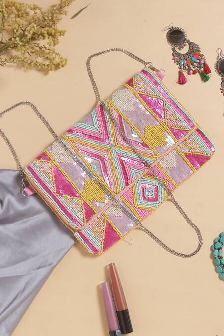 Pink Sequins, Beads Geometric And Embellished Boho Bag