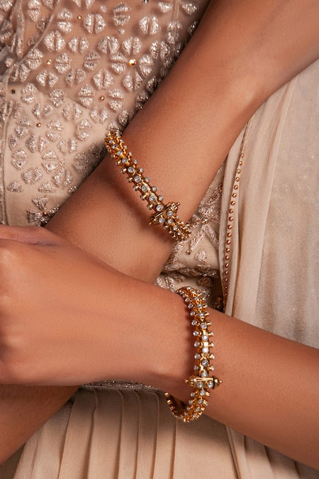 Gold bangle featuring circular kundan embellishments and a screw barrel closure