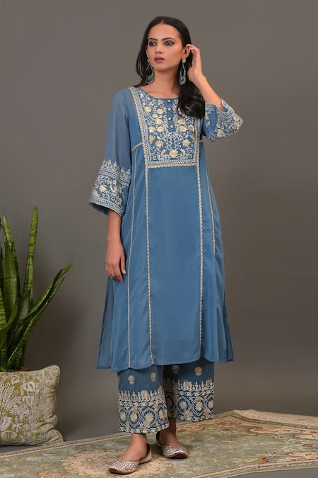 Buy_NUHH_Blue Georgette, Chanderi And Cotton Voile Round Embroidered Kurta & Pant Set _Online_at_Aza_Fashions