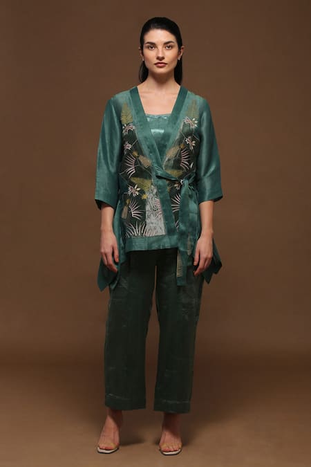 Green jacket with applique work floral motifs & tie-up detailing at the waistline. Paired with linen satin bustier & tissue silk pant.