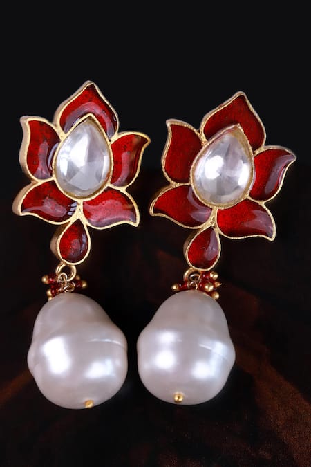 Noteworthy Feature: Floral shape with red meenakari embellishment, Large pearl drops, E-coated for longevity