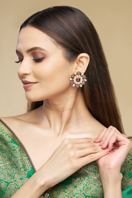 Gold tone floral stud earrings featuring Meenakari work in red and blue