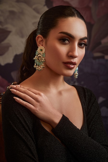 Noteworthy Feature: Fine gold-hued floral kundan stud, Crescent motif with embellishments, Lined with white beads