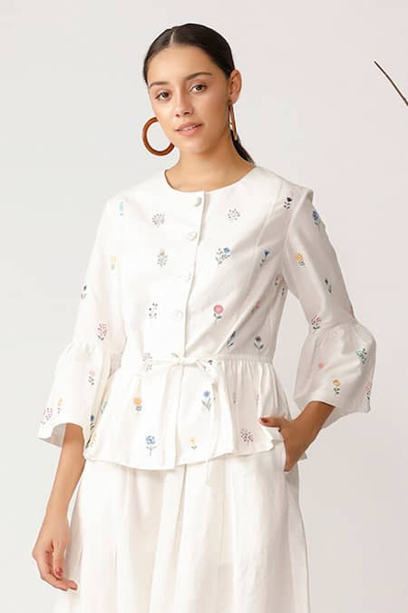 Ecru peplum top with floral embroidered motifs, front button placket, tie-up detail & bell sleeves.