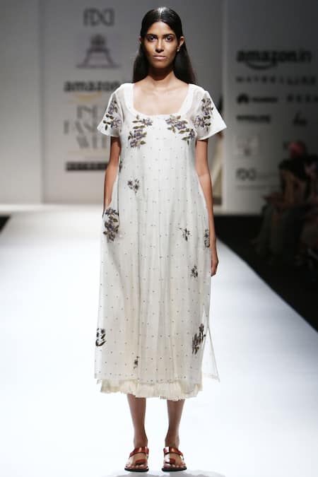 Off-white chanderi kurta with floral French knotted embroidered motifs & polka dots all-over. It comes with a crinkled cotton inner.