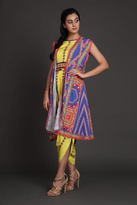 Yellow draped dhoti-jumpsuit with all-over print in striped pattern. Comes with lace trim border cobalt blue long jacket & pom pom tassel belt.