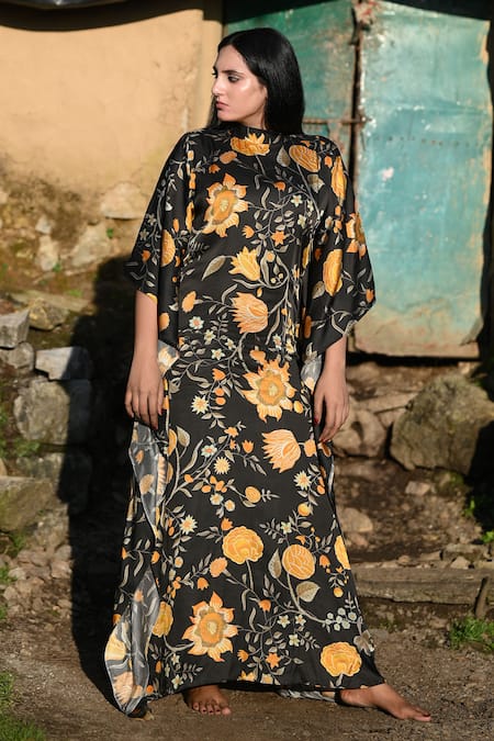 Black Velvet Round Neck Vegan Silk Floral Print Kaftan