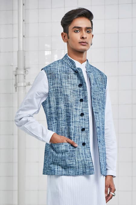 Melange blue Nehru jacket with button-front closure & welt pockets.