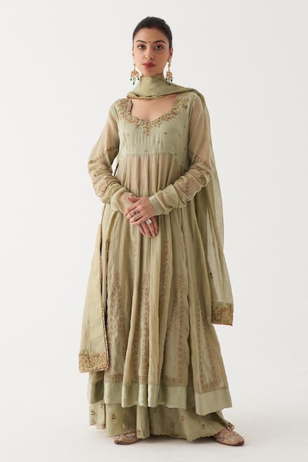 Green Dupatta Tissue , Kurta Noor Embroidered Anarkali Set