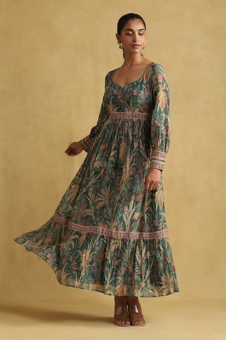 Green flared maxi dress featuring a V neck and cuff sleeves with a botanic print
