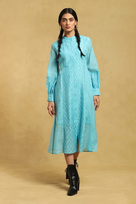 Blue Cotton, Silk Mandarin Collar Geometric Pattern Dress