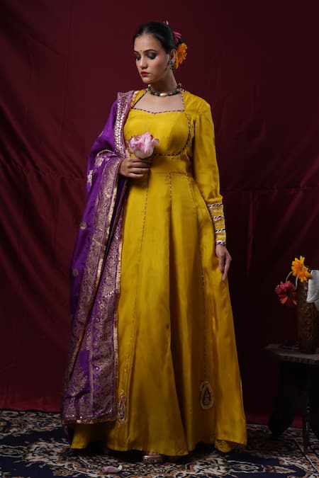 Mustard yellow Viscose Russian Silk Anarkali featuring a deep V-neckline, full sleeves, and subtle embroidery on the side and sleeves. Paired with a purple dupatta adorned with zari work.