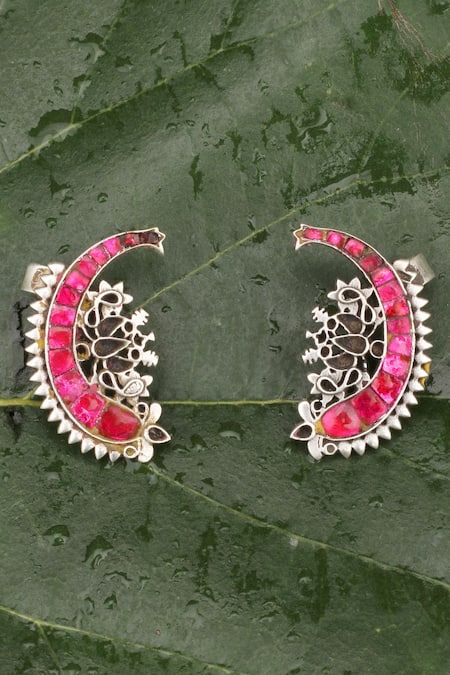Silver ear cuffs featuring carved details and studded with pink kundan