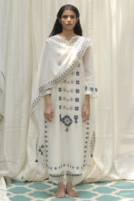 Off white kurta with floral embroidered motifs & flared sleeves. Paired with pant & dupatta.