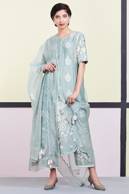 Blue straight kurta with all-over floral motif work & scallop hem. Comes with pants & tassel border dupatta.