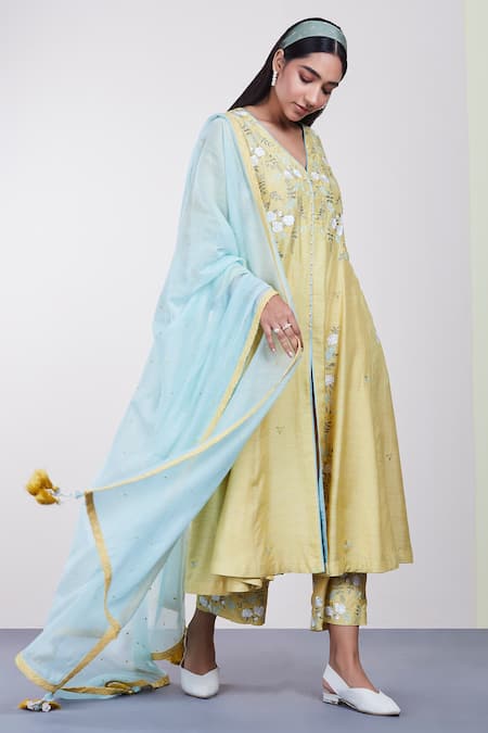 Yellow kurta with applique embroidered floral motifs. Comes with pant and dupatta.