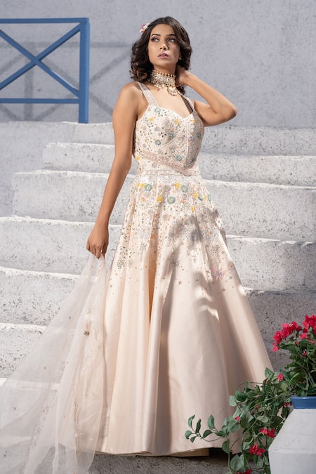 Beige Silk Taffeta V Neck Embroidered Anarkali With Dupatta