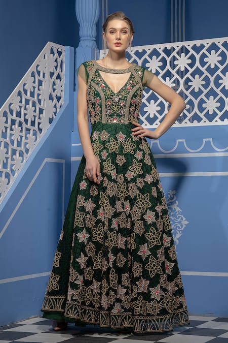 Bottle green flared gown with floral, checkered embroidered motifs & back V-cutout.