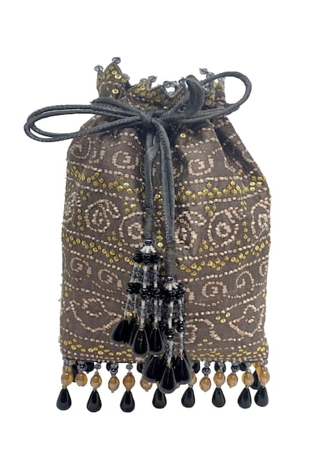 Grey potli bag featuring all-over bandhej print with multi-bead tassels and cutwork detail